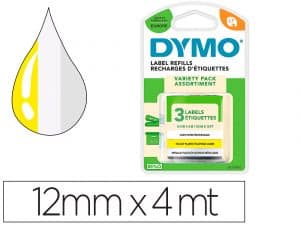 Cinta dymo metalizada letratag 12mm x 4mt papel blanco / plastico amarillo / metalica plata pack de 3