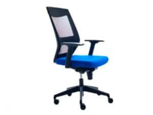 Silla rocada de oficina con brazos tapizada en tela ignifuga azul y respaldo en polimero negro