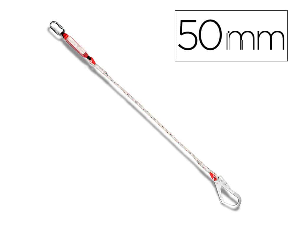 Elemento de amarre con absorbedor de energía, fabricado con cuerda torcida de 13mm de diámetro, equipado con gancho de acero de 50mm de apertura y mosquetón. Apto para anticaídas