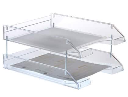 Bandeja con fondo liso. Posibilidad de utilizar varillas elevadoras metálicas que aumentan su capacidad facilitando el acceso a los documentos. Con hendidura frontal para un fácil acceso. Para documentos formatos DIN A4 y folio. Color cristal. Medidas: 260 x 60 x 340 mm.