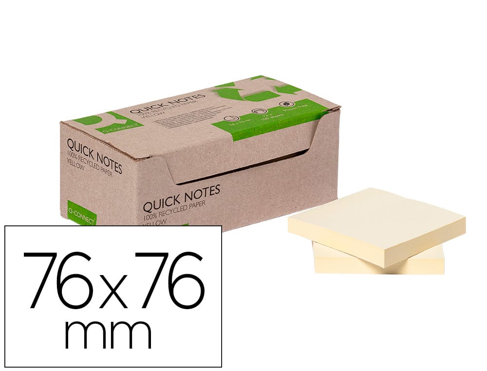 Bloc de notas adhesivas quita y pon q-connect 76×76 mm 100% papel reciclado amarillo en caja de carton