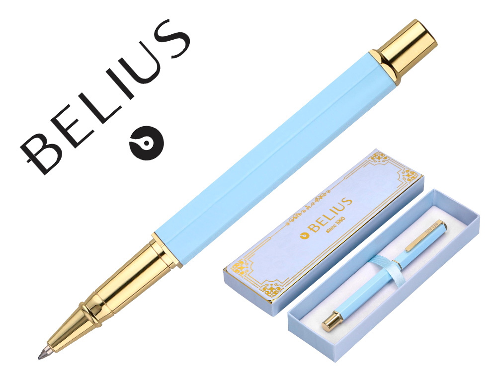 Boligrafo belius macaron bliss forma hexagonal color celeste y dorado tinta azul caja de diseño