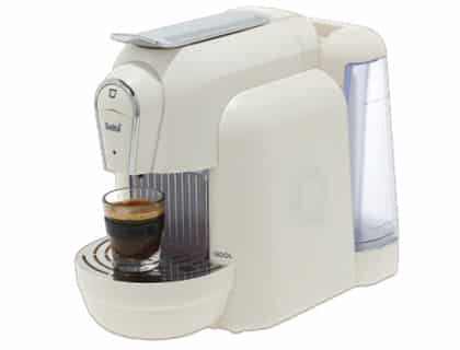 Cafetera de capsulas de café y té Delta Q. Bajo consumo. Teclas de mando: Botón on-off, extracción de expreso 35 ml, extracción de café 50 ml. Interrupción de la extracción. Botones de extracción programables. Expulsión automática del residuo de la cápsula utilizada. Contenedor de hasta 10 cápsulas usadas. Depósito de 1,1 l. Capacidad del depósito para gotas: 0,30 l. Presión: 19 bares. Potencia: 1.200 W. Medidas: 265 x 307 x 205 mm. Peso: 4 kg.