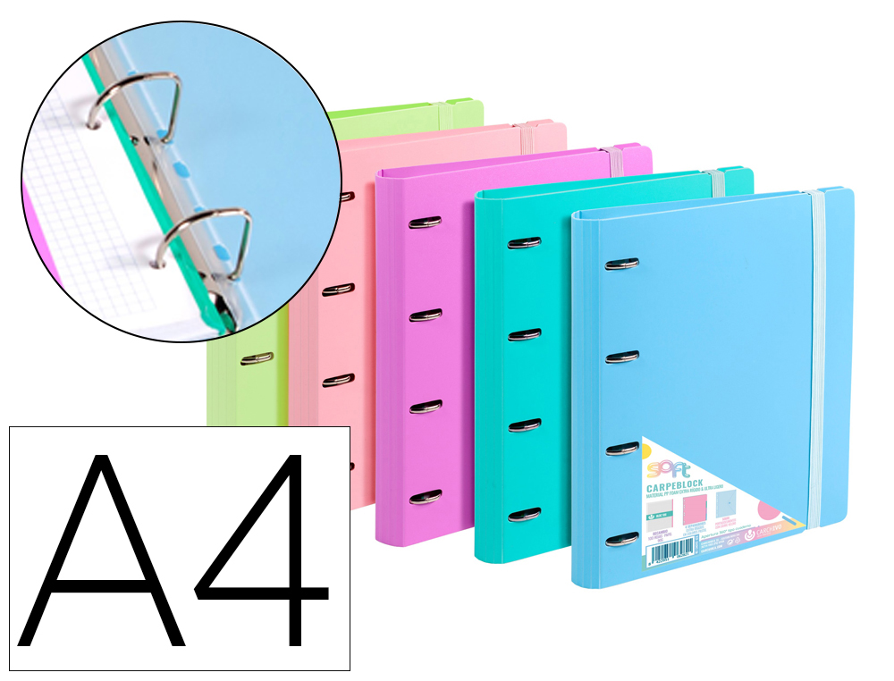 Carpeblock de polipropileno Foam de 2 mm de grosor con 4 anillas de 35 mm.Incluye recambio de 100 hojas de 90 gr con 1 banda de color. Incluye sobr e son solapa y velcro de cierre para guardar pequeños objetos tales como bolígrafos, tarjetas, etc. Contiene 4 separadores de polipropileno en tonos pastel.