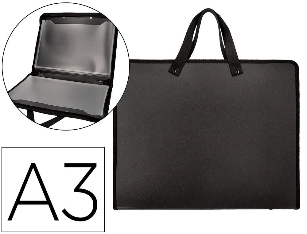 Fabricada en polipropileno. Con asas de tela. Cierre con cremallera. Dos bolsillos interiores. 750 micras. 2 bolsillos interiores de 200 micras. Ideal para dibujo y diseño gráfico. Color negro. Formato DIN A3.