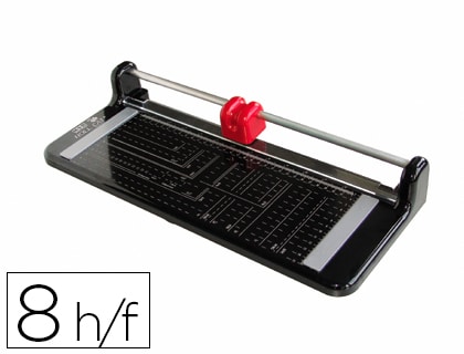 Máquina cortadora con base fabricada en poliestireno resistente a los golpes. Robusta y con medidas grabadas en centímetros, pulgadas y resto de formatos habituales. Cabezal de seguridad que protege la cuchilla. Precisa y fácil de utilizar. Color negro. Permite el corte en ambos sentidos. Capacidad de corte: 8 hojas. Longitud de corte: 320 mm (DIN A4). Medidas: 390 x 57 x 160 mm.