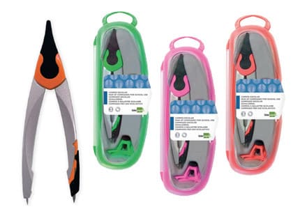 Compás escolar con 2 minas de 2 mm de repuesto. Contiene adaptador universal. Se presenta en estuche de plástico transparente y de color. Colores surtidos: naranja, rosa y verde. Longitud: 13 cm. Circunferencia: 22 cm.