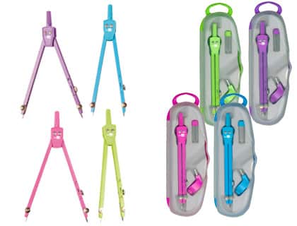 Compás articulado en un brazo con estuche de minas de 2 mm y adaptador de rosca. Colores surtidos: azul, rosa, verde y violeta. Longitud: 14 cm. Circunferencia: 38 cm.