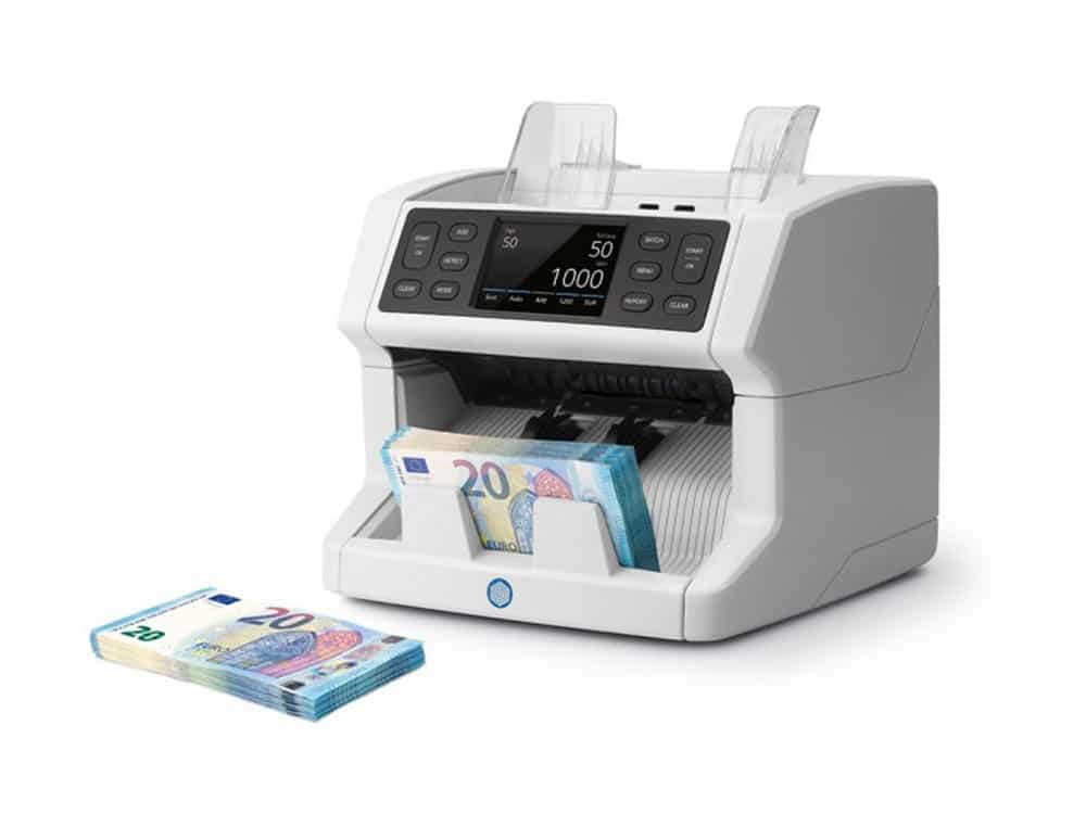 Contadora totalizadora de billetes ordenados o mezclados. 10 divisas. Detección de billetes falsos en 7 puntos. 100% testada BCE y BOE. Pantalla táctil y menú multilingüe, notificaciones y apertura panel superior para mantenimiento, puerto USB para actualizaciones. Velocidad: 1.200 billetes/minuto.