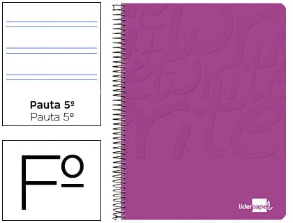 Tapa de cartoncillo impresa y plastificada en polietileno brillo con relieve. Contratapa de cartoncillo. Papel de 60 g/m². Espiral nylonizada negra. Con margen. Coil-lock. En 7 colores diferentes: amarillo, azul, naranja, rojo, rosa, turquesa o verde. Formato folio.