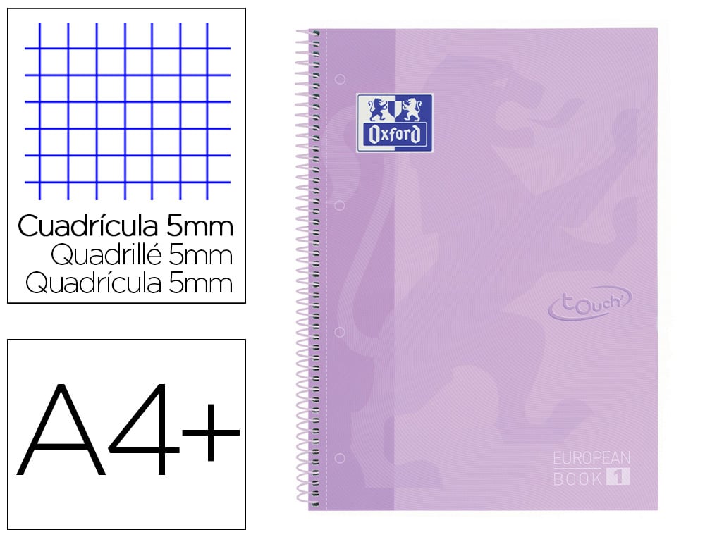 Cuaderno espiral oxford ebook 1 school touch te din a4+ 80 hojas cuadro 5 mm con margen malva pastel