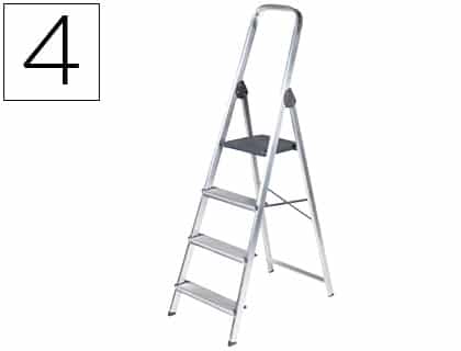 Fabricada con materiales de alta fiabilidad cumpliendo la norma EN-131 y GS. Con sistema de bloqueo y bandeja para herramientas. Peso máximo soportable: 150 kg. Medidas: 43 x 149 x 72 cm. Peso: 3,20 kg. 4 peldaños.
