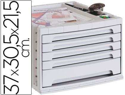 Módulos de cajones apilables y con tope de seguridad para evitar que se caigan al abrirlos. Suave deslizamiento. Agujero en la base para una fácil extracción de los documentos. Acepta documentos de hasta 270 x 320 mm. Incluye bandeja organizadora en la parte superior para tener siempre a mano los accesorios de oficina. Su diseño ergonómico y funcional facilita un apilamiento muy estable con la simple colocación de un módulo sobre otro. Medidas: 305 x 215 x 370 mm.