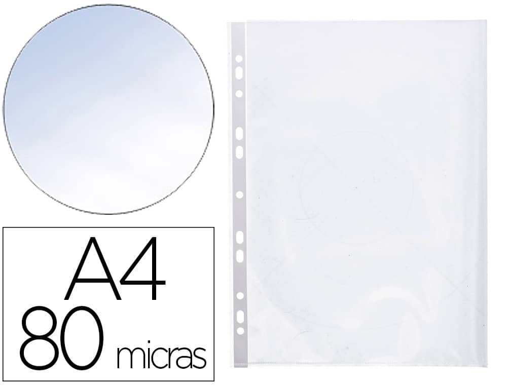 Funda multitaladro para protección y archivo de documentos. Con abertura lateral izquierda, para facilitar el acceso a los documentos. Fabricada en polipropileno transparente liso antiestático. 11 taladros. Grosor: 80 micras. Formato DIN A4. La bolsa de 25 unidades.