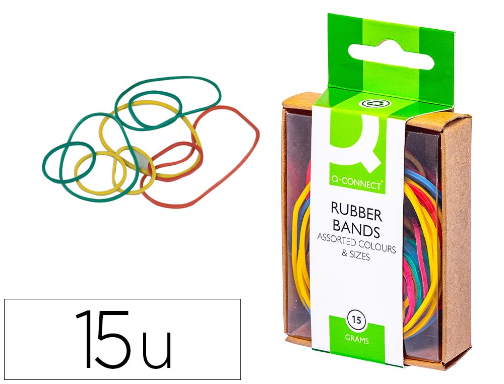 En caja de plástico rígido de 15 g. Gomillas surtidas del nº 8 (8 cm) y del nº 4 (4 cm).