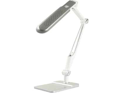 Lámpara de oficina. De ABS, 9 W, CCT de 3000 (luz cálida) a 6500 (luz fría) grados kelvin, con tira de 32 LEDs, con lumen de 1300 lux. Interruptor por sensor de 3 niveles de luminosidad. Tiempo de vida estimado: 2 años. Brazo y pie oscilantes. Color cromado. Medidas: 155 x 562 x 220 mm. Longitud del cable: 1,3 m.