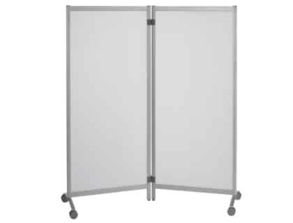 Mampara translúcida con 2 paneles en polipropileno y estructura de aluminio. Equipada de un pie fijo y de un pie móvil con ruedas. Geometría variable. Unidas con 4 clips de conexiones. Medidas: 76 + 76 x 170 x 44 cm. Peso: 19 kg.