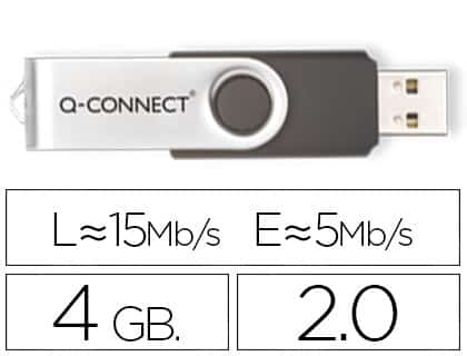 Los pendrives USB Q-Connect ofrecen un excelente funcionamiento y un práctico formato. Velocidad de lectura hasta 15 MB/s. Velocidad de escritura hasta 5 MB/s. Color negro, con protector giratorio metálico. Orificio para colocar un cordón. Medidas: 55 x 18 x 8,9 mm.