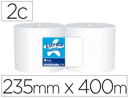 Bobina de papel industrial 100% celulosa. 2 capas. 235 mm de ancho x 400 m de largo. Diámetro: 300 mm. Mandril: 76 mm de diámetro. Gramaje: 17,5 g/m². El paquete de 2 rollos.