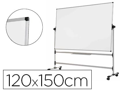 Pizarra blanca de acero vitrificado magnético. Con marco de aluminio 100% reciclado y reciclable. Volteable doble cara. Con ruedas para su fácil desplazamiento. Con bandeja extraancha para rotuladores y accesorios. Medidas: 150 x 120 cm.