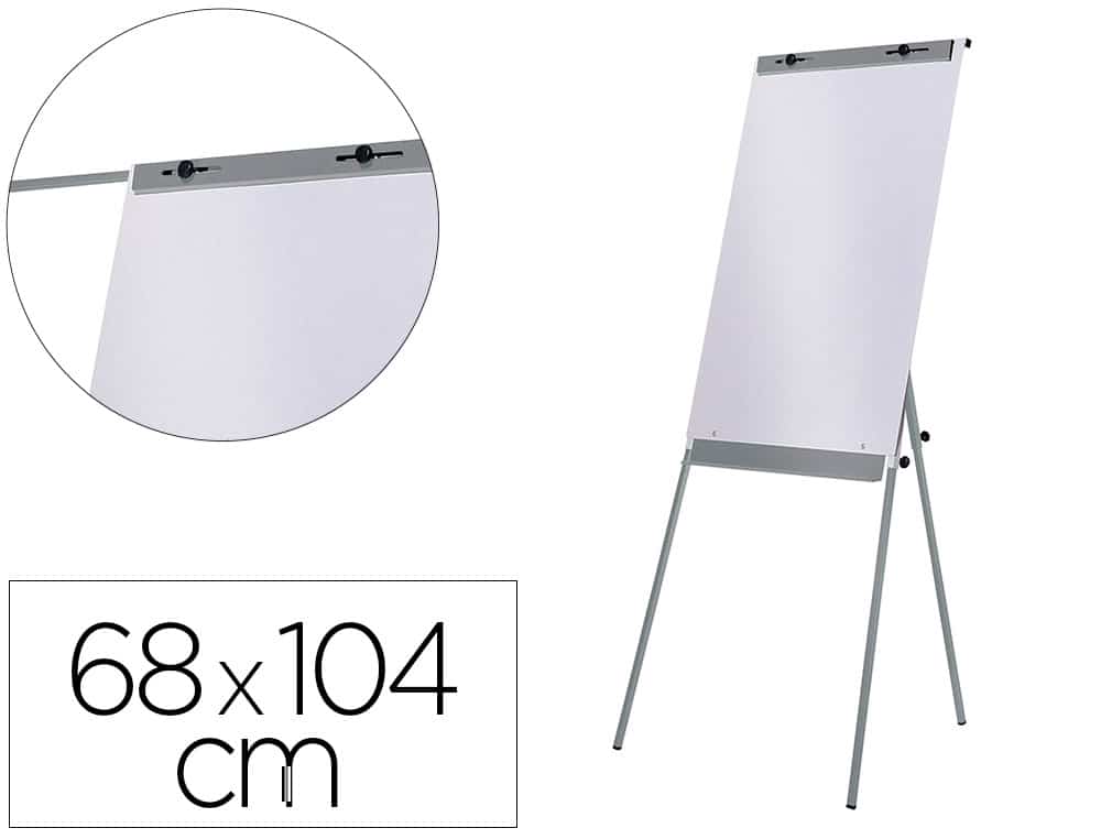 Pizarra de conferencias trípode con superficie metálica y magnética, ideal para escribir con rotuladores de pizarra blanca. Embellecedor de diseño en la parte superior para esconder los pomos de sujeción del bloc de papel. Regulable en altura hasta 190 cm. Incluye un brazo extensible. Con bandeja para rotuladores y accesorios. Medidas del tablero: 68 x 104 cm.