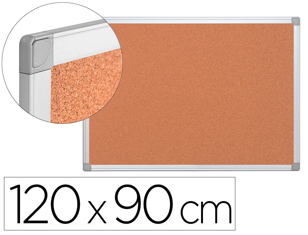 Con marco de aluminio plata mate y cantonera decorativa de plástico gris claro. Provisto de accesorios de fijación a la pared. 5 mm de grosor de corcho extra.
