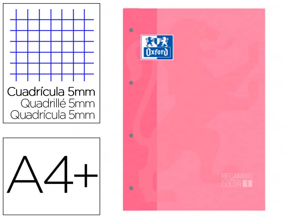 Recambio color 1 oxford din a4+ 80 hojas 90 gr cuadro 5 mm 4 taladros color rosa chicle