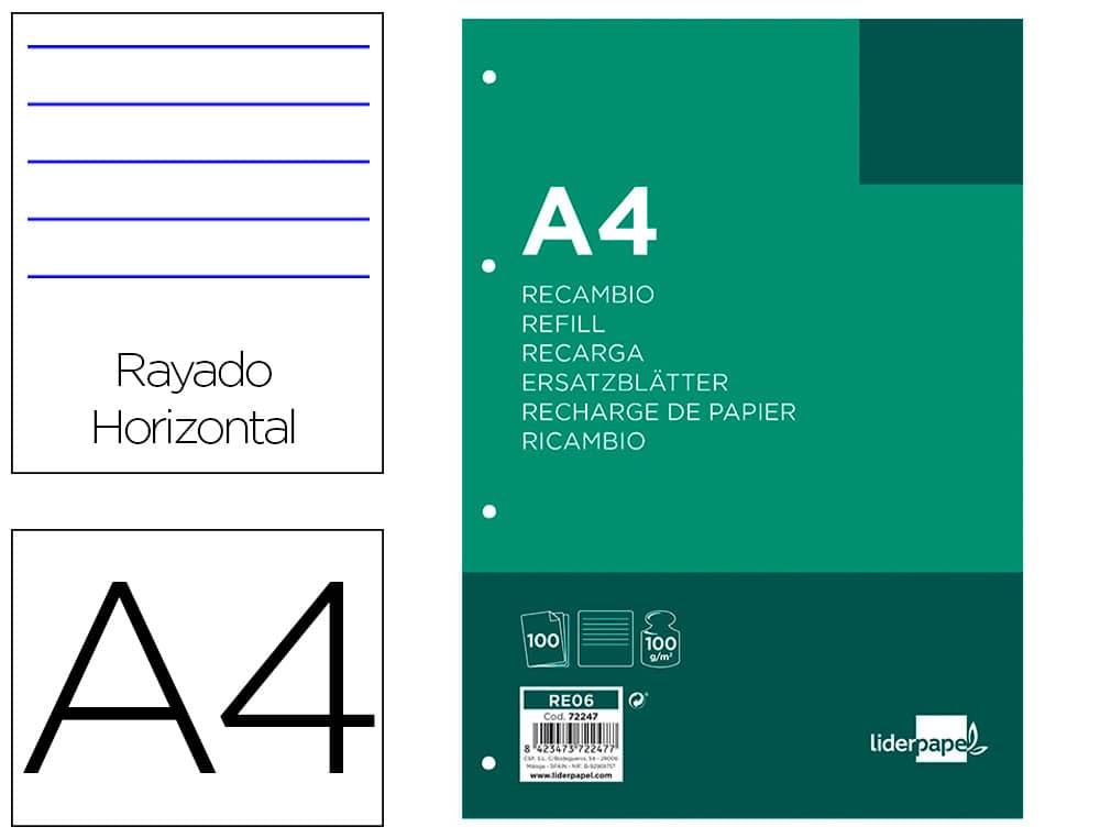 Recambio liderpapel a4 100 hojas 100 g/m2 rayado horizontal 4 taladros bandas de 5 colores