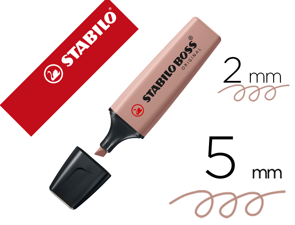Rotulador fluorescente Stabilo Boss Original Pastel Nature Colors. Antisecado, hasta 4 horas destapado sin secarse para poder concentrarse en el trabajo. Resistente a la luz en todo tipo de papel normal, térmico y fotocopias. Punta biselada. Trazo de 2 a 5 mm. Color ocre oscuro.