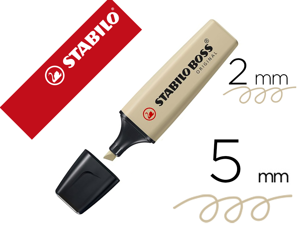 Rotulador fluorescente Stabilo Boss Original Pastel Nature Colors. Antisecado, hasta 4 horas destapado sin secarse para poder concentrarse en el trabajo. Resistente a la luz en todo tipo de papel normal, térmico y fotocopias. Punta biselada. Trazo de 2 a 5 mm. Color verde barro.
