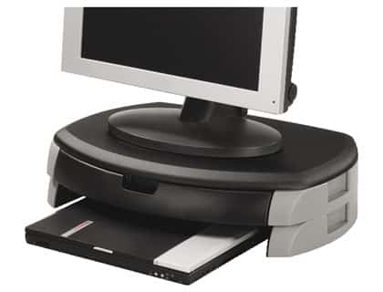 Soporta monitores de LCD hasta 20 , CRT o impresoras. La amplia plataforma extra sirve para colocar altavoces o una impresora. Robusto soporte trasero para asegurar que el monitor no se caiga hacia atrás. Cajón amplio extra con diferentes compartimentos para guardar los objetos de oficina. Espacio extra para colocar su teclado. Medidas: 583 x 120 x 335 mm. Peso: 2,7 kg.