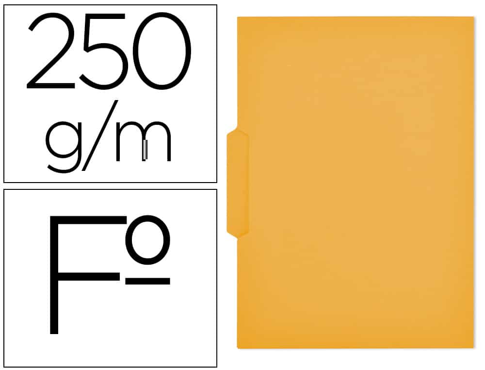 Subcarpeta con pestaña, ideal para subdividir información en carpetas colgantes. Pestaña escribible. Hendidos para incorporar fástener. Resistente para uso intensivo. Fabricada en cartulina de 250 g/m². Capacidad máxima: 100 hojas. Color amarillo.