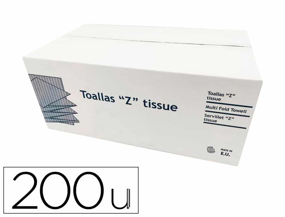 Toalla de papel secamanos. Plegado en Z. 2 capas. Caja con 20 paquetes de 200 unidades. Medidas: 225 x 210 mm.